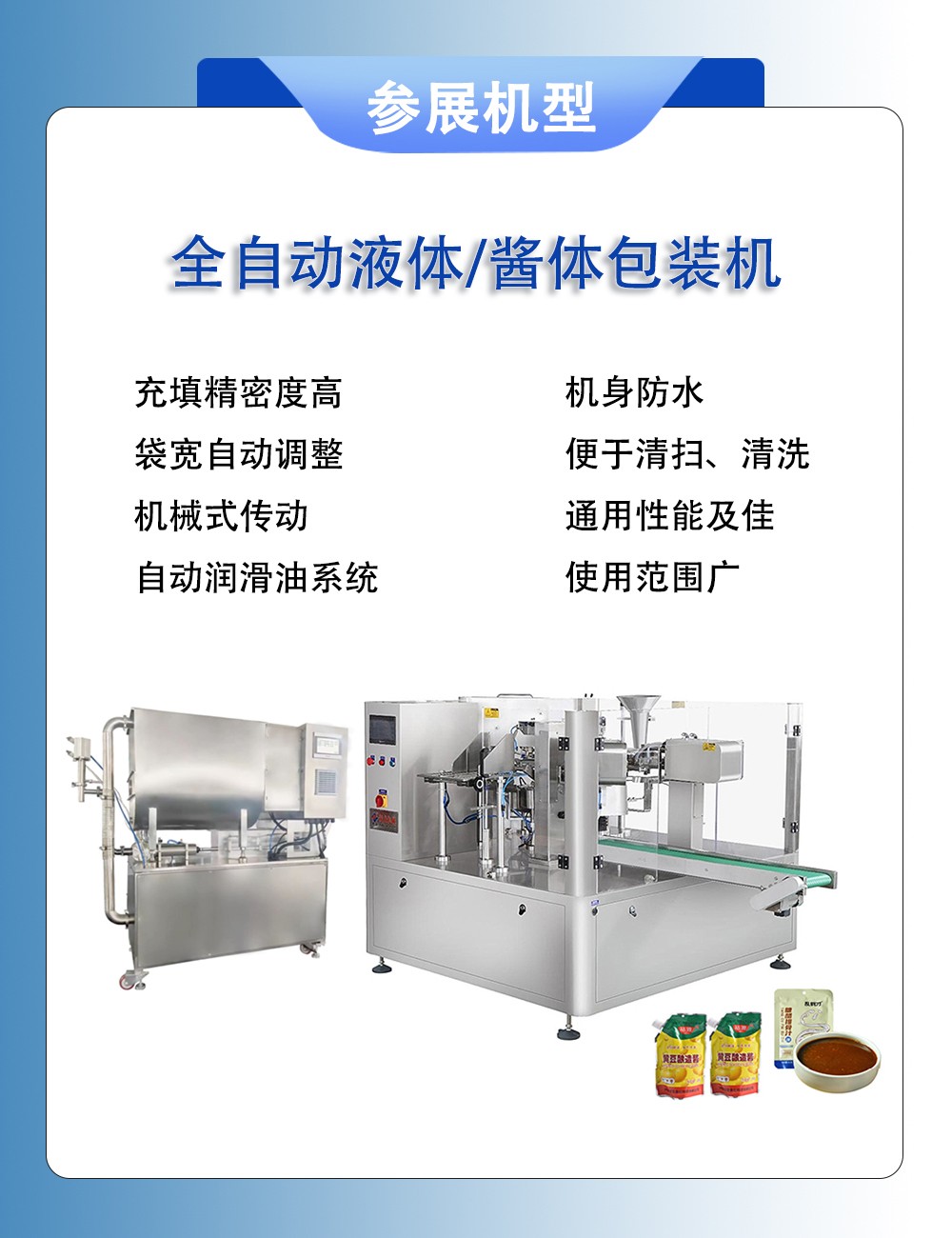 四邊封液體包裝機(jī) | 高速給袋式包裝機(jī) | 酵素果凍提取液體包裝機(jī) | 全自動辣椒醬包裝機(jī) | 全自動洗衣液包裝機(jī) | 全自動液體包裝機(jī)| 火鍋底料灌裝機(jī)| 灌裝機(jī)|